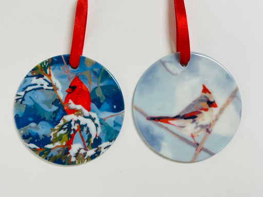 This 2 sided glossy round ceramic ornament features the male cardinal on one side and the female on the other. 2 7/8” tied with a red fabric ribbon.